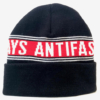 With the rising tide of fascism all around the globe the past several years it is often important to declare upon which side we stand. This beanie not only does that, but also helps keep yer noggin warm. The words “ALWAYS ANTIFASCIST” wrap around this 100% acrylic knit beanie in black, red and white. One size fits all.