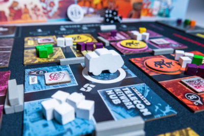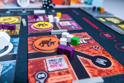 Night-time: The Night-time phase is when each faction takes its turn. At the start of a turn, cards are drawn from the Police Ops deck that move and deploy police squads across the city. Higher Police Morale means more cards. Next, the faction rolls action dice and spends those dice to take various actions around the city using their blocs. Each bloc represents an organized group of 5-15 people.